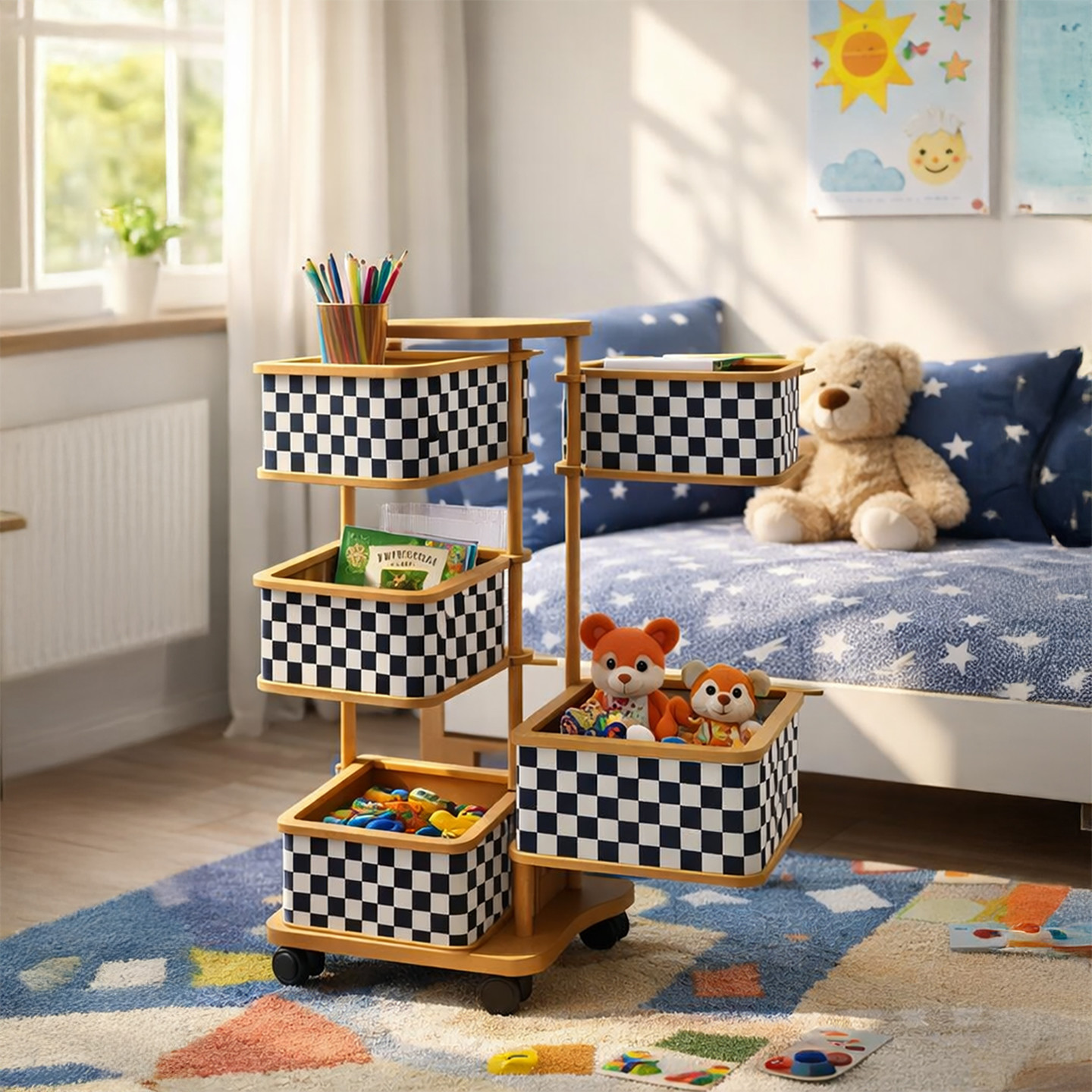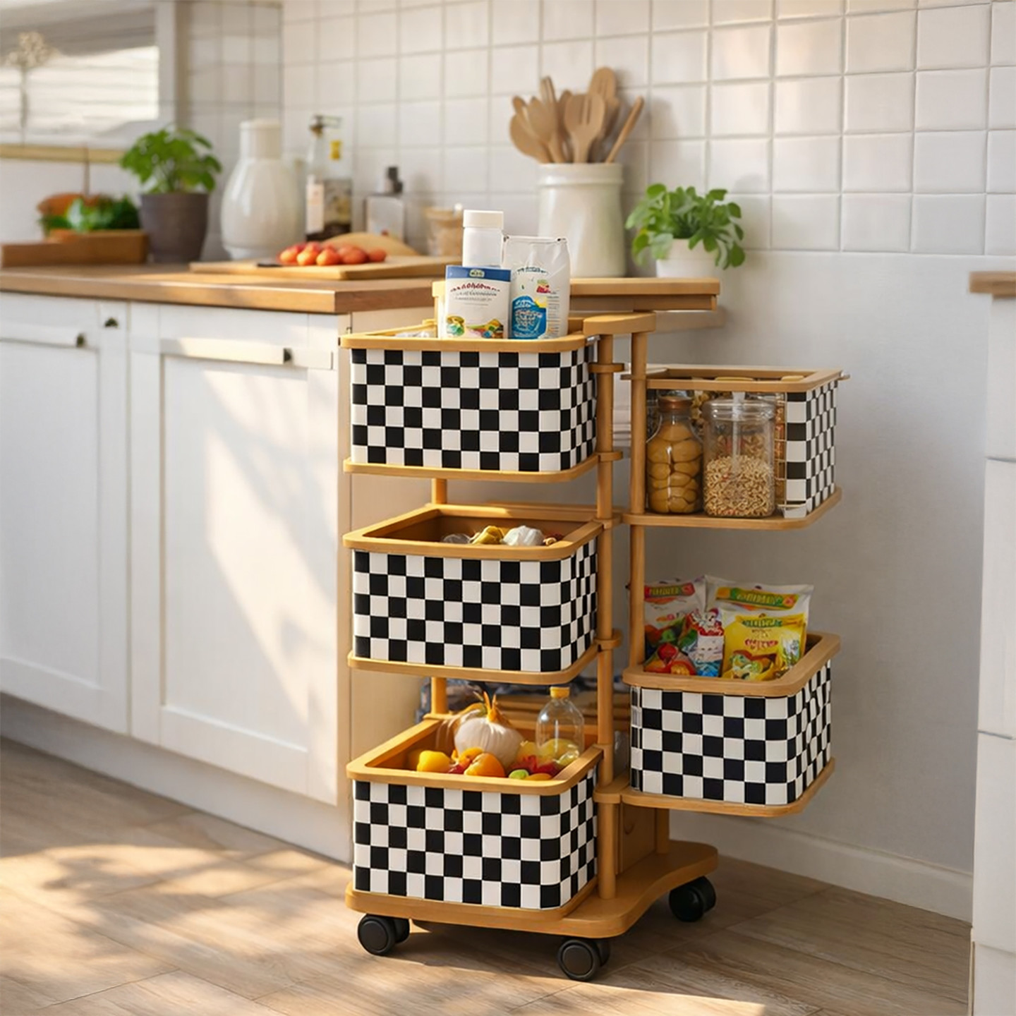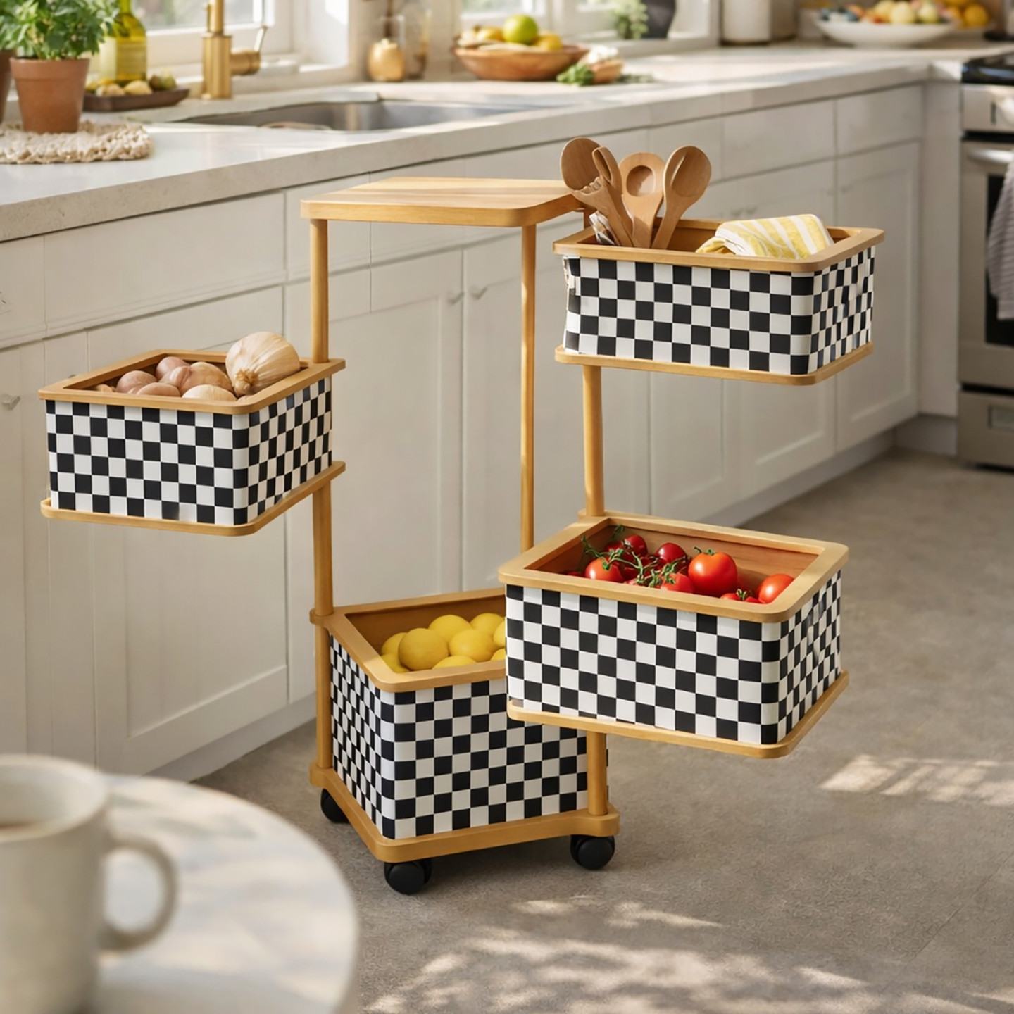 Ahşap 4 Katlı Tekerlekli Sebzelik ve Çok Amaçlı Organizer