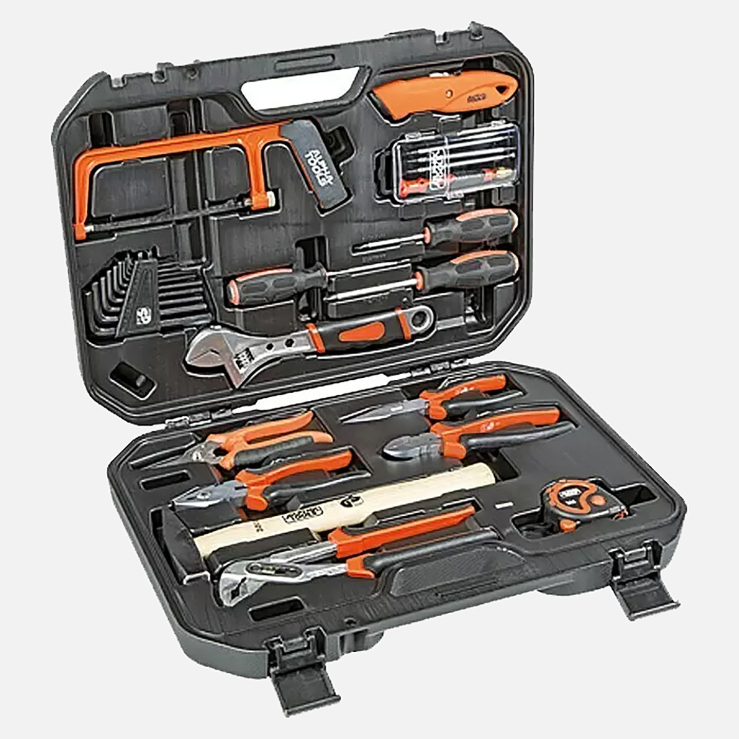 Alphatools alet çantası geniş bir alet yelpazesi sunar. 27 parçadan oluşur ve diğer şeylerin yanı sıra çekiç, testere, şerit metre, çeşitli penselerin yanı sıra bıçak, mini testere, altıgen anahtarlar, makas ve çok daha fazlasını içerir. Bu alet kutusu DIY kullanımı için standart bir alet seti sunar.