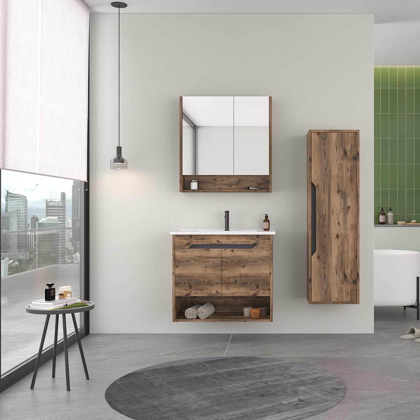 Ayna dolaplı üst modül, ek depolama imkanı sunar. Altı açık raflıdır.