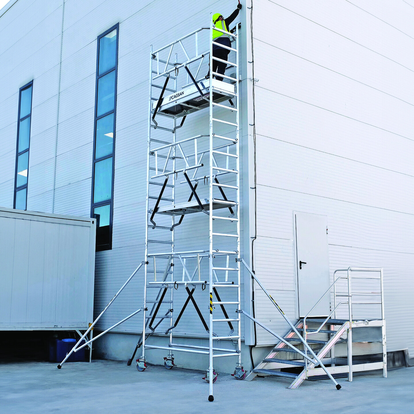 Hafif ve kullanışlı: Alüminyum malzemeden imal edilen iskelelerimiz, hafif ve kullanışlıdır, bu da çalışma alanında rahat taşınabilirlik sağlar.