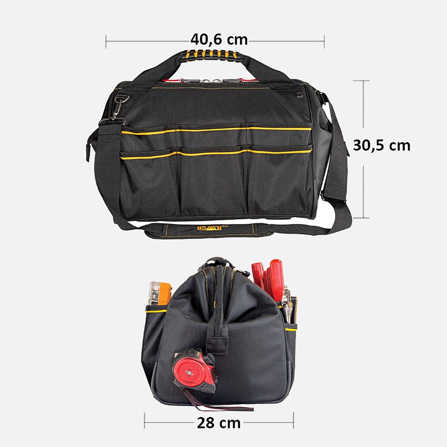 •CAT 16'' geniş ağızlı ağır hizmet tipi alet takım çantası maksimum alet taşıma kapasitesi için toplam 18 + 1 açık cep ve geniş düz ve düzenli bir iç alana sahiptir.
