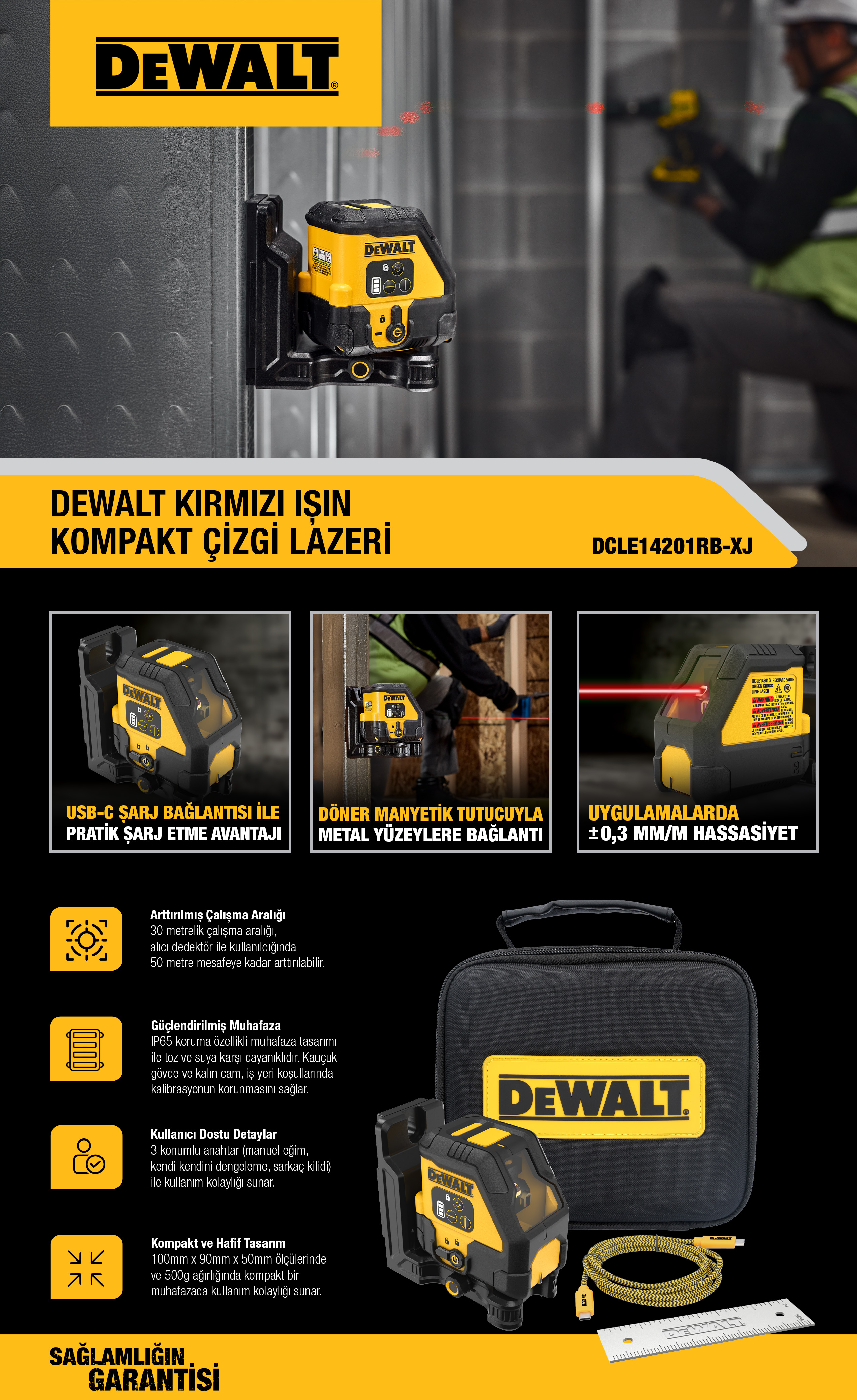 • Kırmızı Işın Diyotu: 30 m’ye kadar görünürlük ve dedektörle birlikte (ayrı satılır) 50 m’ye kadar kullanım imkanı sunar. Şantiyede daha iyi görünürlük sağlar.