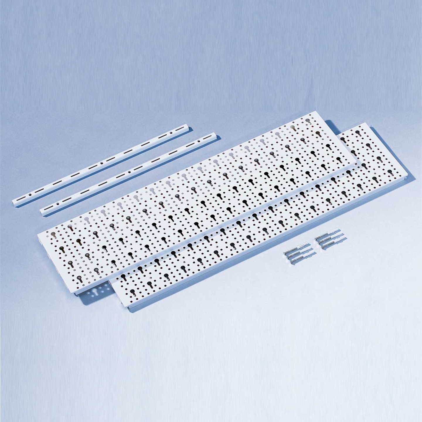• İçindekiler: 2 adet 80x20cm çelik delikli plakadan oluşan atölye seti 2 adet 50cm tek sıra duvar rayından, montaj malzemesi, vidalar ve dübeller dahil.
