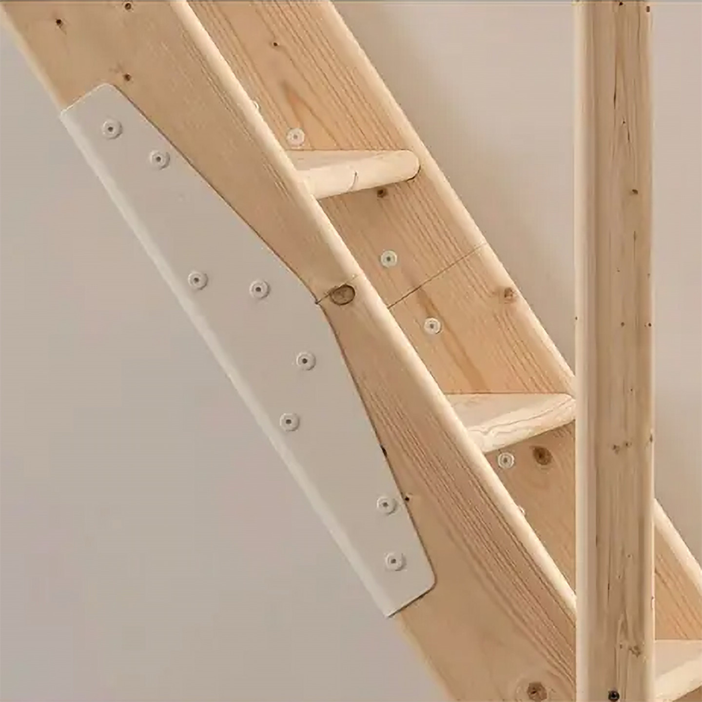 Montaj Malzemeleri: Merdivenin taban ve üst kat bağlantısı için, yapı durumuna göre en az 2 mm kalınlığında metal açılar, uygun vidalar, dübeller veya ağır yük ankrajları (örneğin 8 x 60 mm altıgen vidalar ve 5 x 25 mm ahşap vidalar) gereklidir. Bu malzemeler ayrıca satın alınmalıdır.
