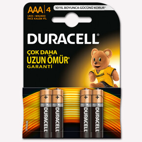 Duracell, güvenilir güç gerektiren elektronik cihazlarda kullanılmak üzere geniş bir pil yelpazesi sunmaktadır. Duracell AAA piller, ek güç gerektiren günlük cihazlara güvenilir şekilde güç sağlamak için ideal çok amaçlı alkalin pillerdir. Duracell alkalin AAA piller - Çok daha uzun ömür garanti* (*2015 IEC AAA standart testinde çinko karbon pillere göre. (www.iec.ch) Sonuçlar cihaza veya kullanım şekline göre değişebilir.) Duracell alkalin piller, AA, AAA, C, D ve 9V boylarında sunulmaktadır. Duralock teknolojisi, normal koşullarda saklandıklarında kullanılmamış Duracell pilleri 10 yıla kadar yeni ve dolu tutar. Bu piller, size güvenebileceğiniz bir ürün sağlayarak, cihazlarınızdan keyif alma özgürlüğü verir. Duracell piller motorlu oyuncaklar, el fenerleri, oyun konsolları, uzaktan kumandalar vb günlük cihazlarınızda güvenilir, uzun ömürlü güç istediğinizde ideal çözümlerdir. 1969’da Duracell, Apollo 11 programının bir parçası haline gelerek Ay’daki ilk pil unvanını kazanmıştır.