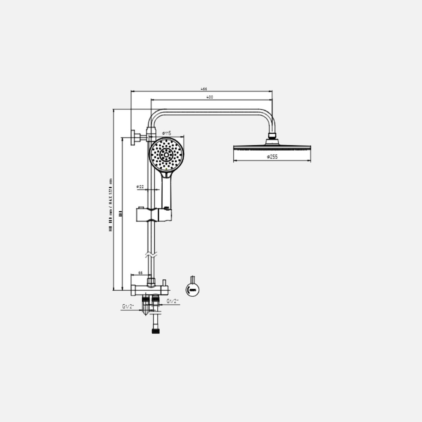 • Duş başlığı akış ekseni 466mm