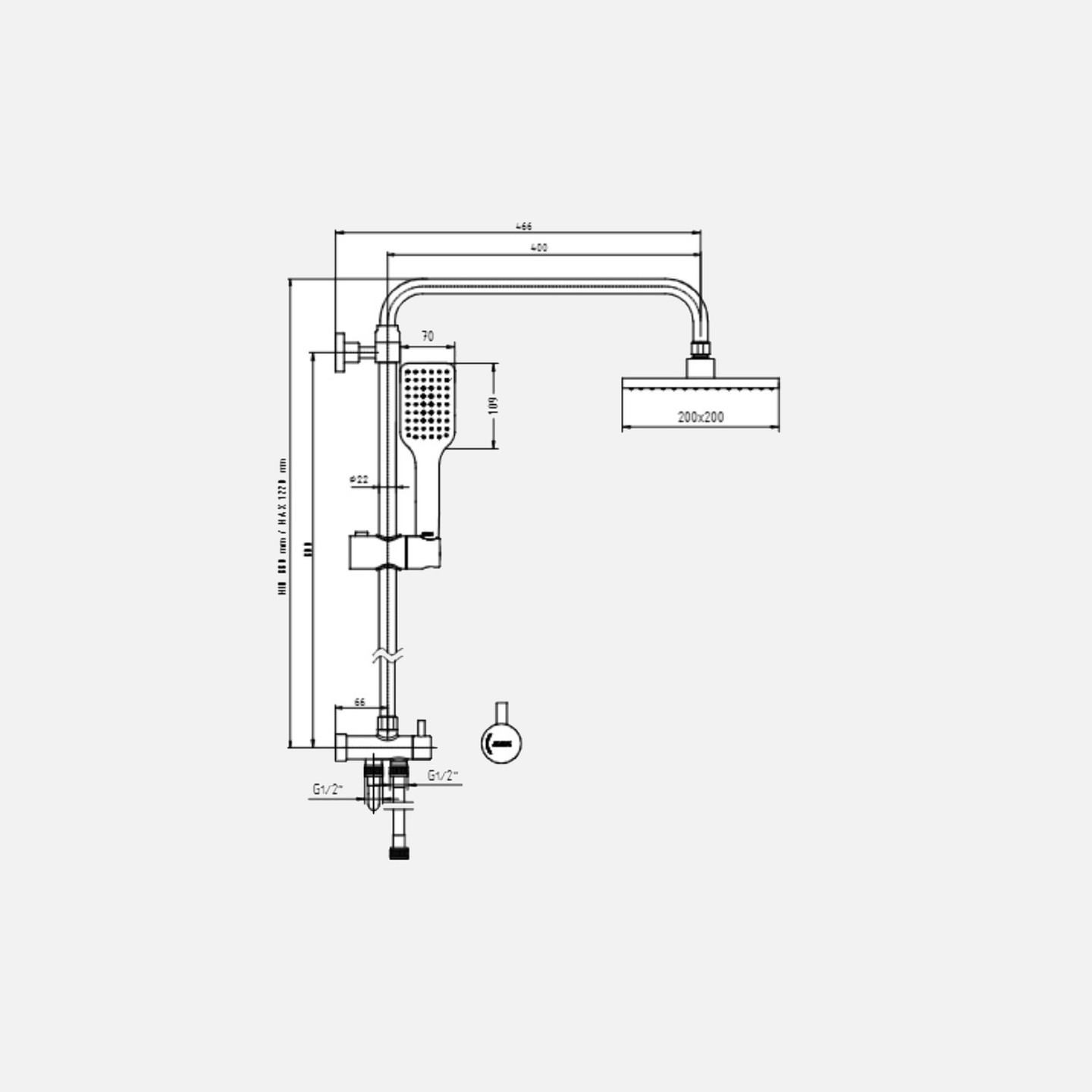• Duş başlığı akış ekseni 466mm