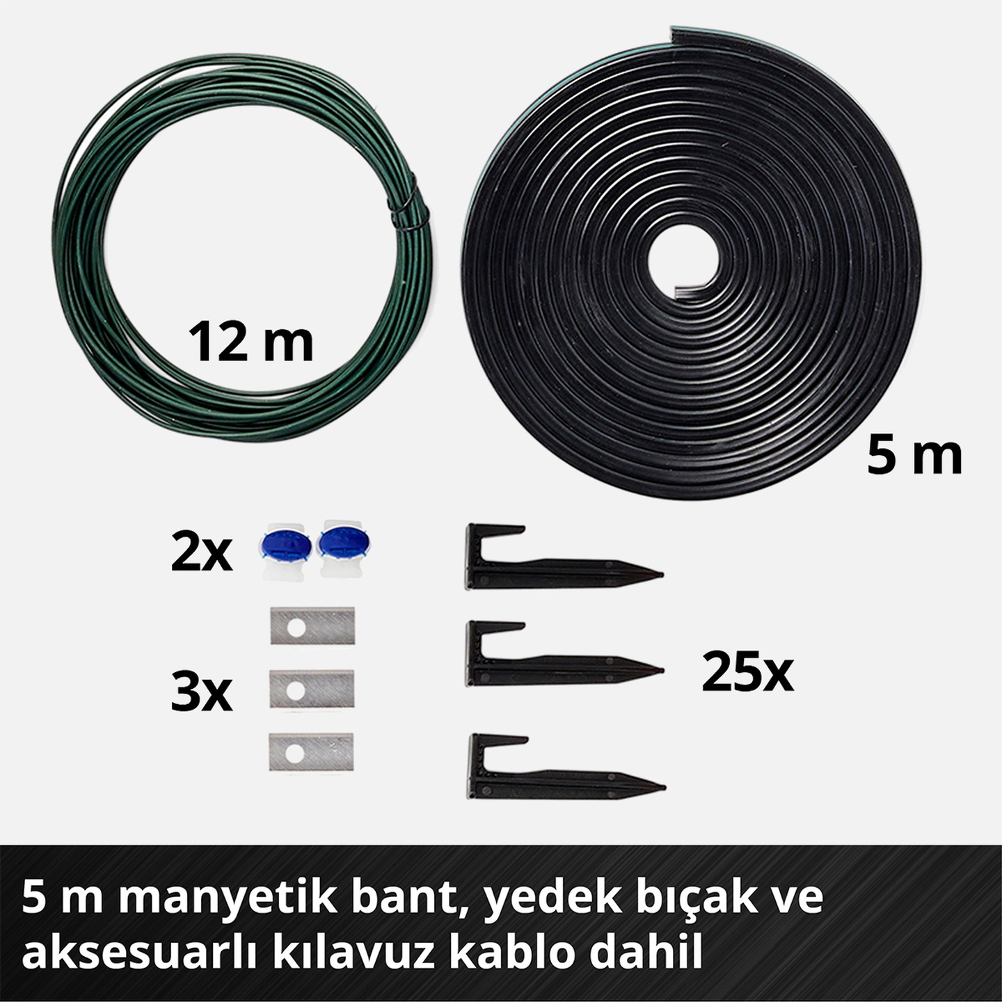 Tek ihtiyacınız olan şarj istasyonu ve kılavuz tel. Bu bir sınır teli değil, çim biçme makinesinin kenetlenmek için kullandığı şarj istasyonunun etrafında 5 m²'lik bir halka.