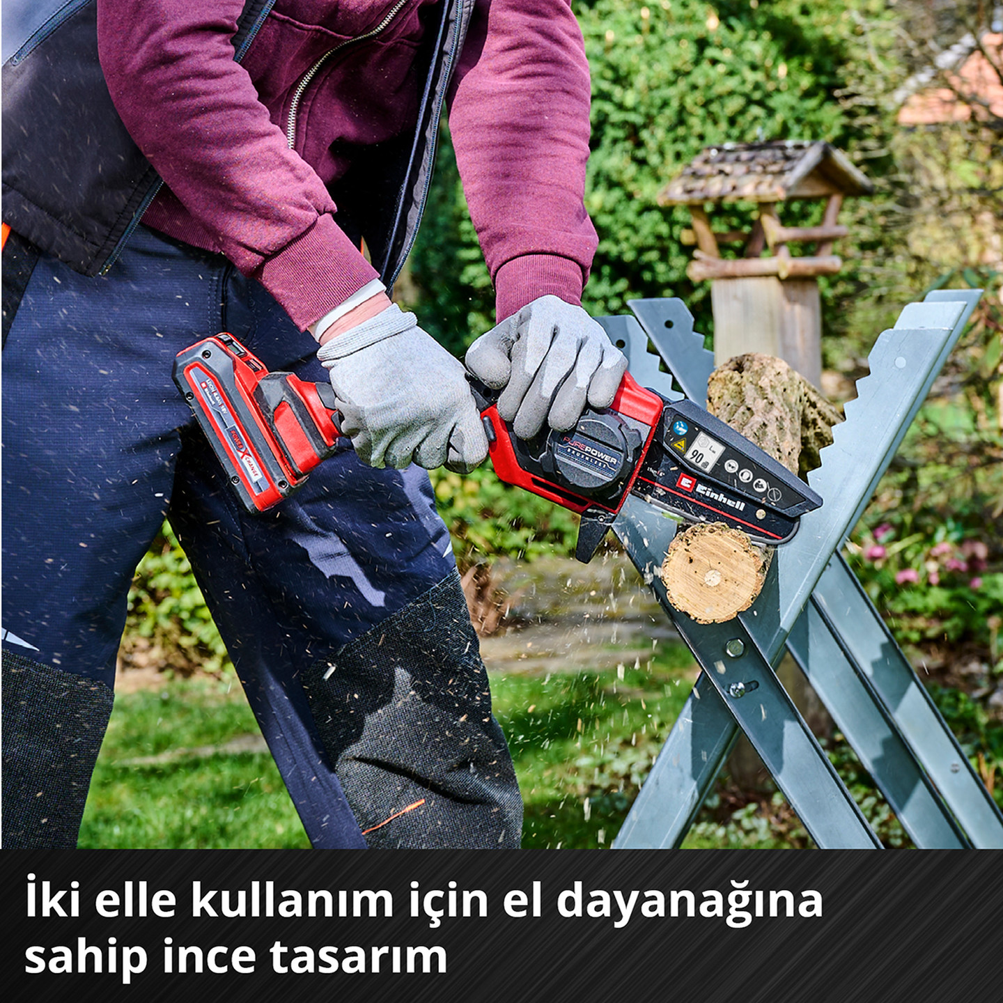 Einhell akülü budama zincirli testeresi GE-PS 18/15 Li Bag Kit, ağaç ve çalıların budanması ve kontur kesimi, bahçe atıklarının doğranması ve daha küçük kesitli kare kerestelerin kesilmesi için kullanışlı bir alettir. Kompakt testere, Einhell Power X-Change ailesinin bir üyesidir ve sistem serisindeki tüm aküler ve şarj cihazlarıyla birleştirilebilir. Alet, bir Einhell Fırçasız motorla çalışır. Bu Fırçasız motor, geleneksel bir karbon fırça motorundan daha fazla güç ve daha uzun çalışma süreleri sağlar. Çevrimiçi kayıt yaptırdığınızda, fırçasız motorun 10 yıllık garantisi vardır. 15,8 cm kılavuz çubuğu uzunluğu ve 12,5 cm kesme uzunluğu ile küçük ve hafif akülü budama zincirli testere, bahçede esnek kullanım için mükemmeldir. Yüksek verimli motor, çok düşük titreşim ve 4,8 m/s'ye kadar zincir hızı sağlar. Testere, yüksek kesme performansı ve en iyi iş sonuçları için yüksek kaliteli bir kılıç ve zincir seti ile birlikte gelir. Kılıç ve zincir, kolay bakım için alet gerektirmeden kolayca değiştirilebilir. Güvenli ve esnek kullanım için testerede el koruması ve katlanabilir zincir kapağı bulunur. İnce sapı, özel yumuşak tutma yüzeyleri ve iki elle kullanım için entegre el dayanağı sayesinde bu pratik bahçe aletini tutmak rahattır. Küçük zincirli testerenin güvenli bir şekilde saklanması için bir kılıç kapağı dahildir. Ayrıca, zincirin manuel olarak yağlanması için bir dozaj yardımcısı ve zinciri yeniden germek için bir altıgen lokma anahtarı da sete dahildir. Sette ayrıca 2,5 Ah Power X-Change akü, şarj cihazı, hızlı zincir değişimi için yedek zincir ve bir Einhell Bag 45/29 bulunur.