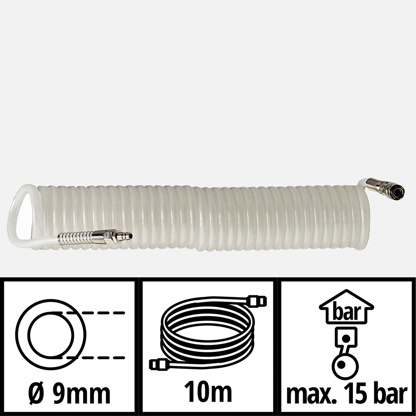 Orijinal Einhell Spiral Hortum, 1/4 inç bağlantı parçalarına sahip piyasada bulunan tüm kompresörler için pratik bir aksesuardır. Lastik basınçlarını hızlıca kontrol etmek mi? Atölye tezgahını temizlemek veya zımba tabancasını kullanmak? Einhell'in doğru yüksek basınç hortumu ile sorun değil! 10 metrelik uzunluğu ile spiral hortum, kompresörün etrafındaki hareket alanını birkaç kat daha fazla genişletir. Şeffaf basınçlı hava hortumu sağlam ve esnektir ve 9,3 mm iç çapa sahiptir. Yüksek basınçlı hortum, maksimum 15 bar çalışma basıncı için tasarlanmıştır. Bu sayede yüksek hava ihtiyacı olan basınçlı hava aletleri için idealdir. Einhell Spiral Hortum, bir kompresöre kolay bağlantı için bir hızlı bağlantı rakoruna ve bir geçmeli nipele sahiptir.