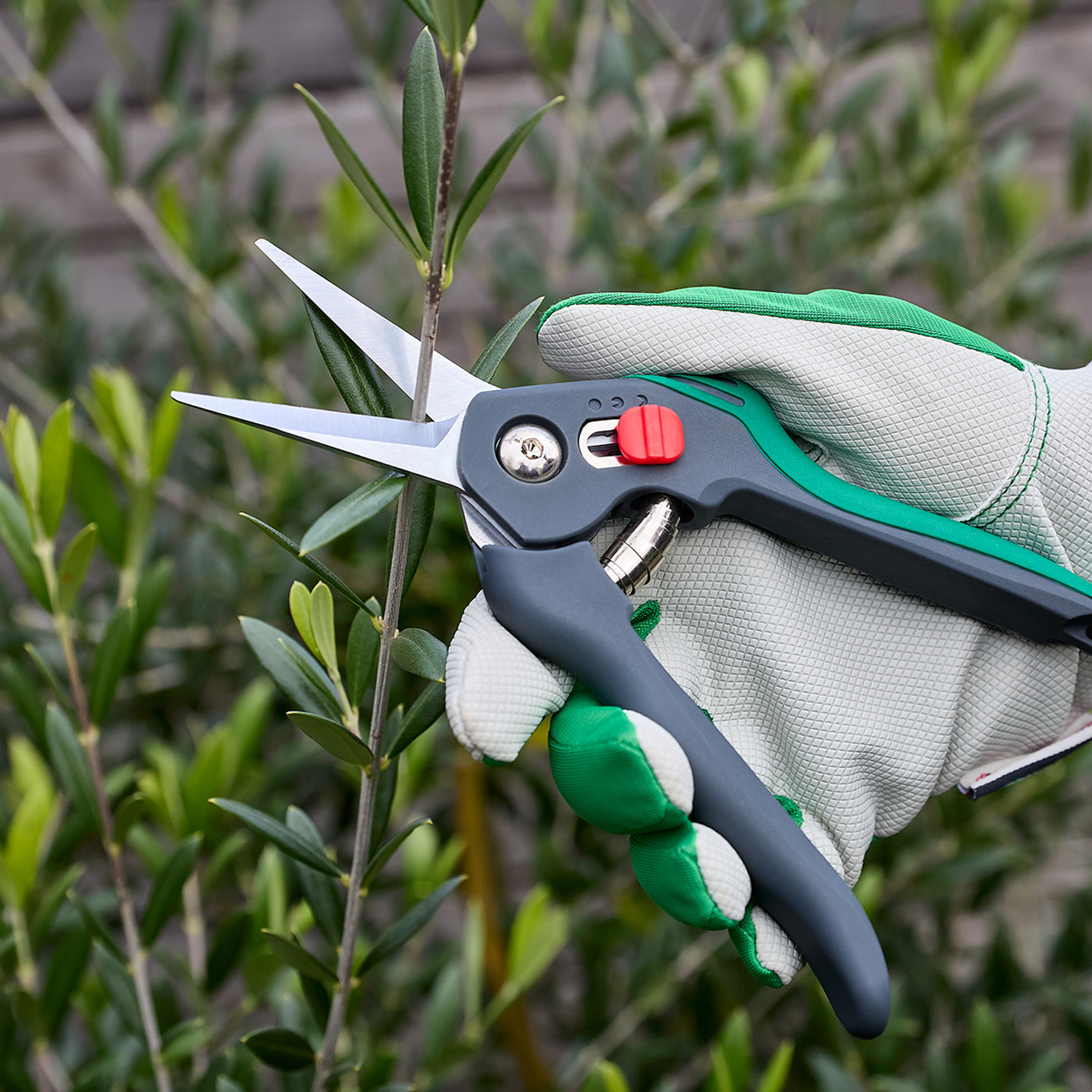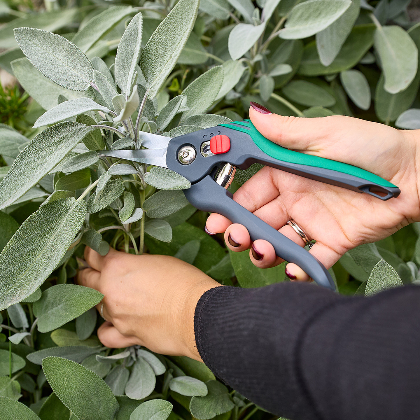 İki bileşenli ergonomik sap, başparmak kilidi ile sabitlenir, elde konforlu bir tutuş sağlar ve makasın çevik ve hızlı kullanımına olanak tanır.
