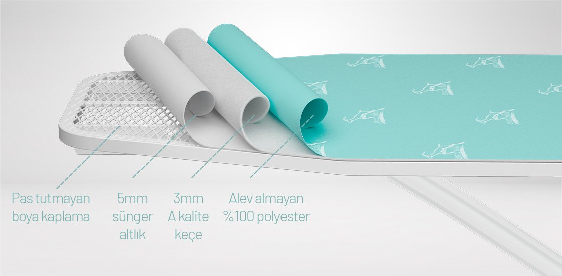 • 3.5 mm keçe ve 5 mm sünger destekli, yüksek kalitede ütüleme imkanı sağlayan ısıya dayanıklı, özel logolu dokuma kumaş.