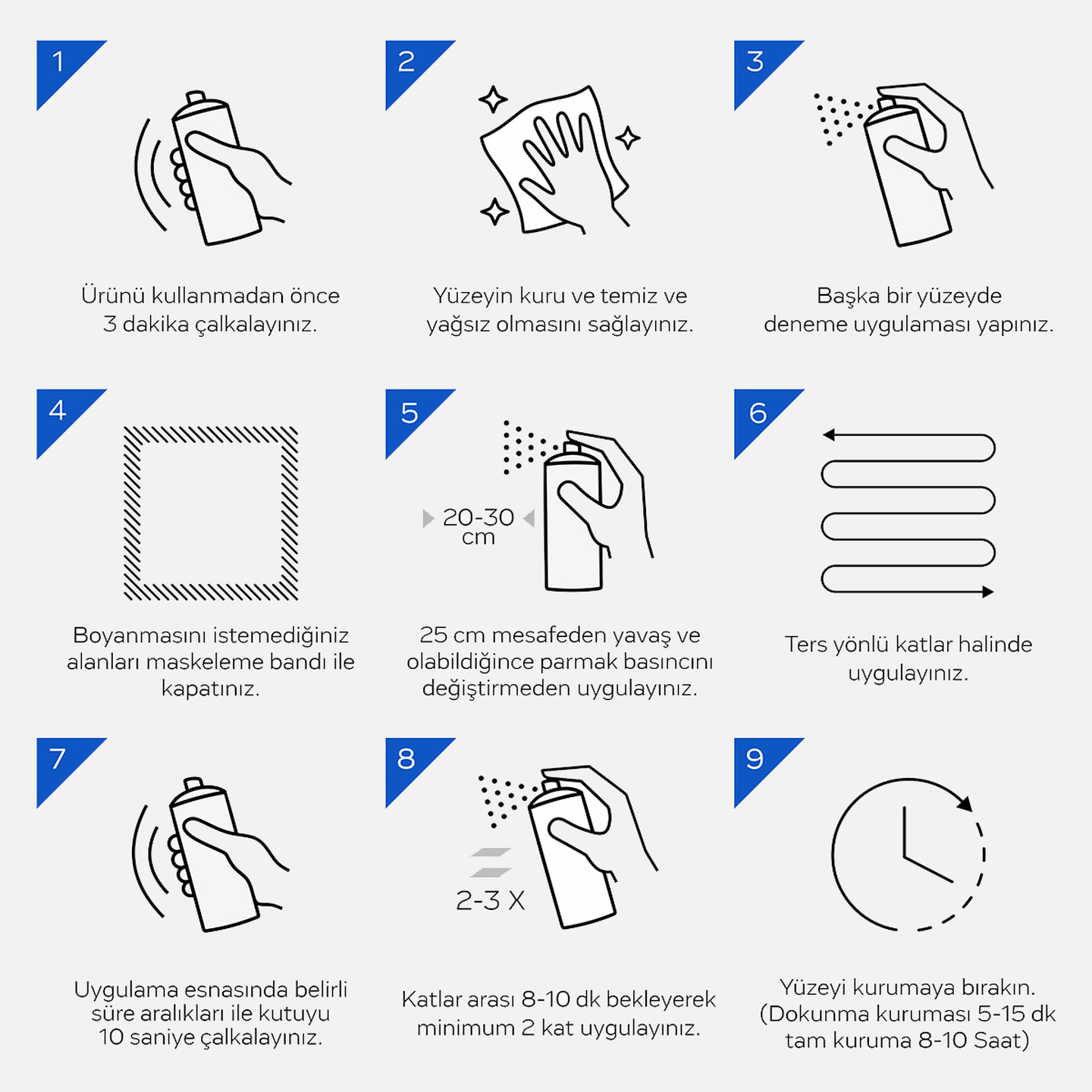 Spreyinizi, içindeki karıştırma bilyesinin sesini duyacağınız şekilde en az 3 dakika çalkalayın. Açık havada veya iyi havalandırması olan bir alanda kullanın. İlk kullanımdan önce, 3-4 saniye boyunca havaya püskürtün ve başka bir yüzey üzerinde deneme boyaması yapınız. Uygulama sonrası tekrar kullanabilmek için kutuyu ters çevirin ve valfi temizlemek için aktüatöre 3-5 saniye basılı tutun.
