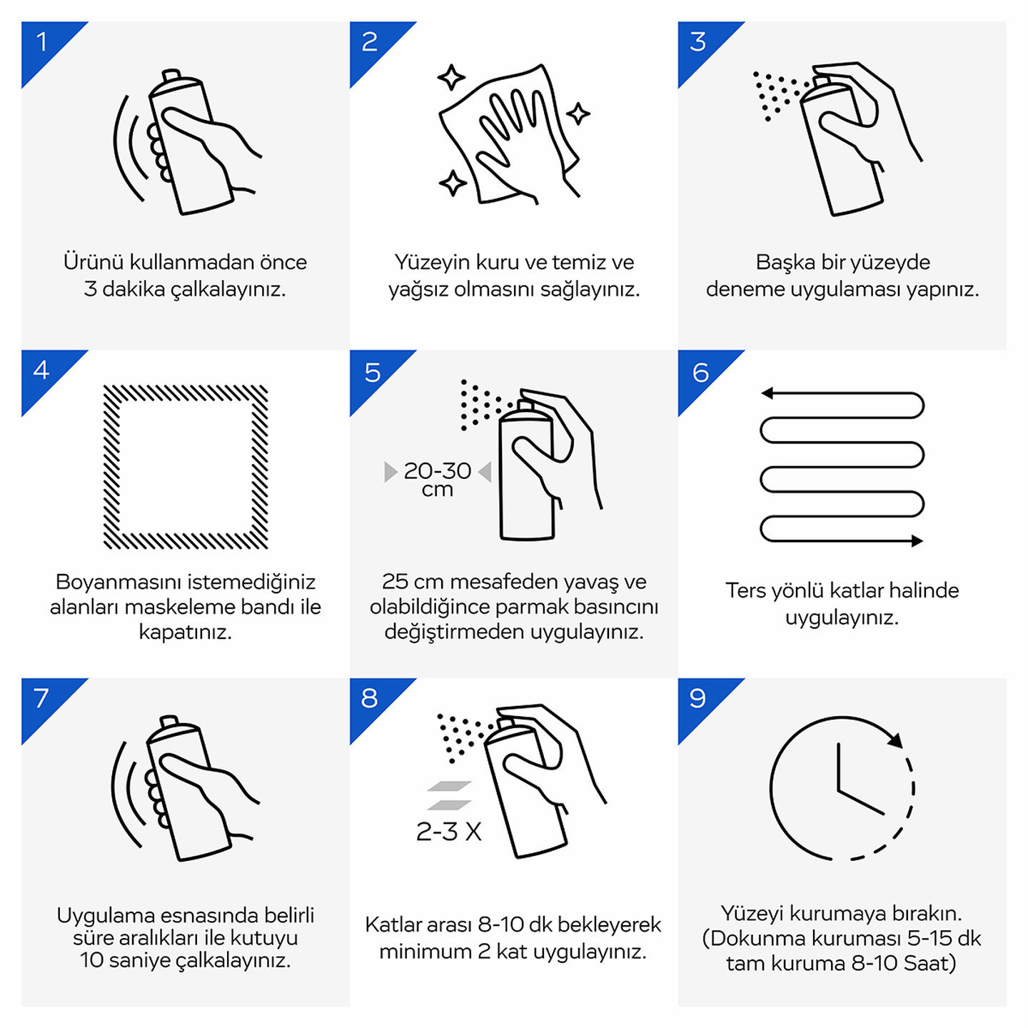 • Spreyinizi, içindeki karıştırma bilyesinin sesini duyacağınız şekilde en az 3 dakika çalkalayın. Açık havada veya iyi havalandırması olan bir alanda kullanın. İlk kullanımdan önce, 3-4 saniye boyunca havaya püskürtün ve başka bir yüzey üzerinde deneme boyaması yapınız. Uygulama sonrası tekrar kullanabilmek için kutuyu ters çevirin ve valfi temizlemek için aktüatöre 3-5 saniye basılı tutun.