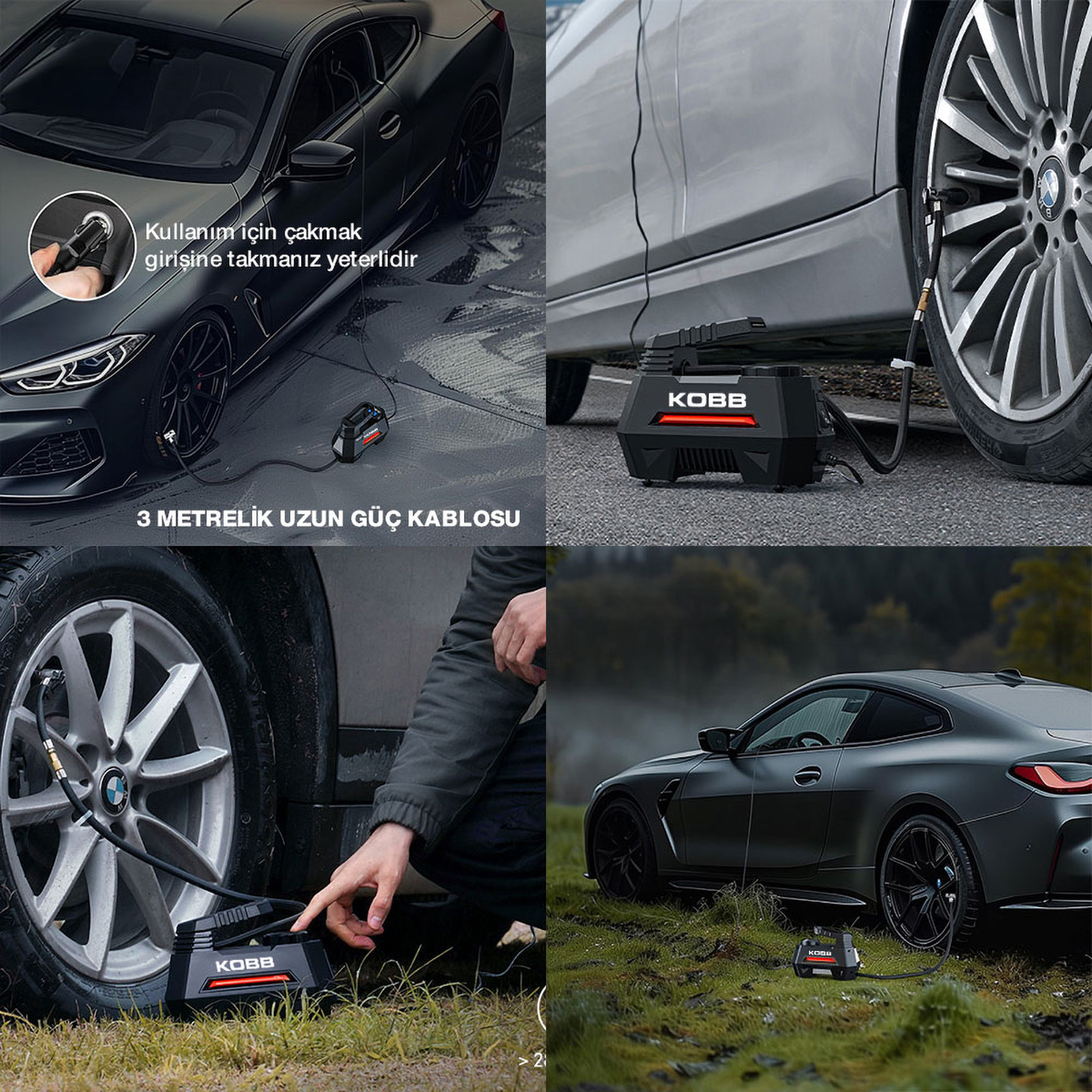 •Güçlü 150 PSI / 10.3 Bar şişirme gücü ile Otomobil, motosiklet, cip, bisiklet lastikleri, top, lastik bot, yatak vb. malzemeleri şişirmek için uygundur,