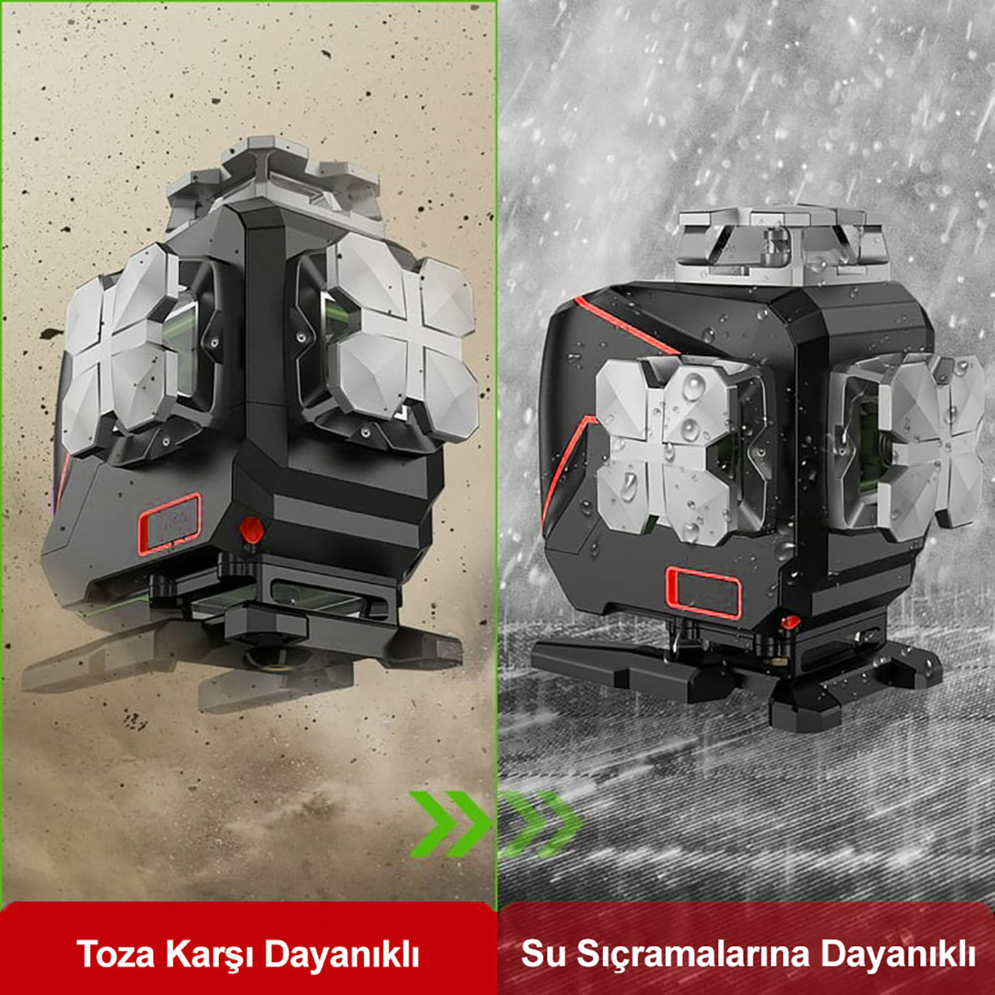 - 360⁰ açı ile dört adet lazer ışınları sayesinde alçıpan bölme odalar, ofisler, makine kurulumları, fabrika çatıları, fayans işçiliği, zemin kaplama gibi dekoratif işlemlerin kullanılmasında su terazisi ve hizalama ipi kullanmadan hızlı ve pratik şekilde çözüm oluşturmanızı sağlar