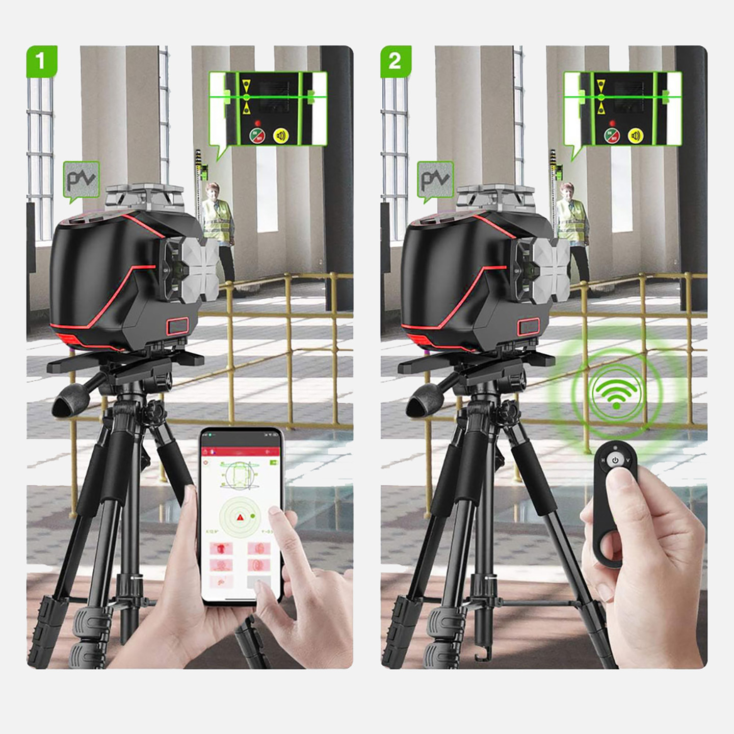 •Dört adet 360⁰ çizgi lazer ile oluşan 10 noktadan artı lazer hattı ile son derece net görünürlüğe sahip LCD Ekranlı uzaktan kontrol edilebilir Yeşil lazer hizalama.