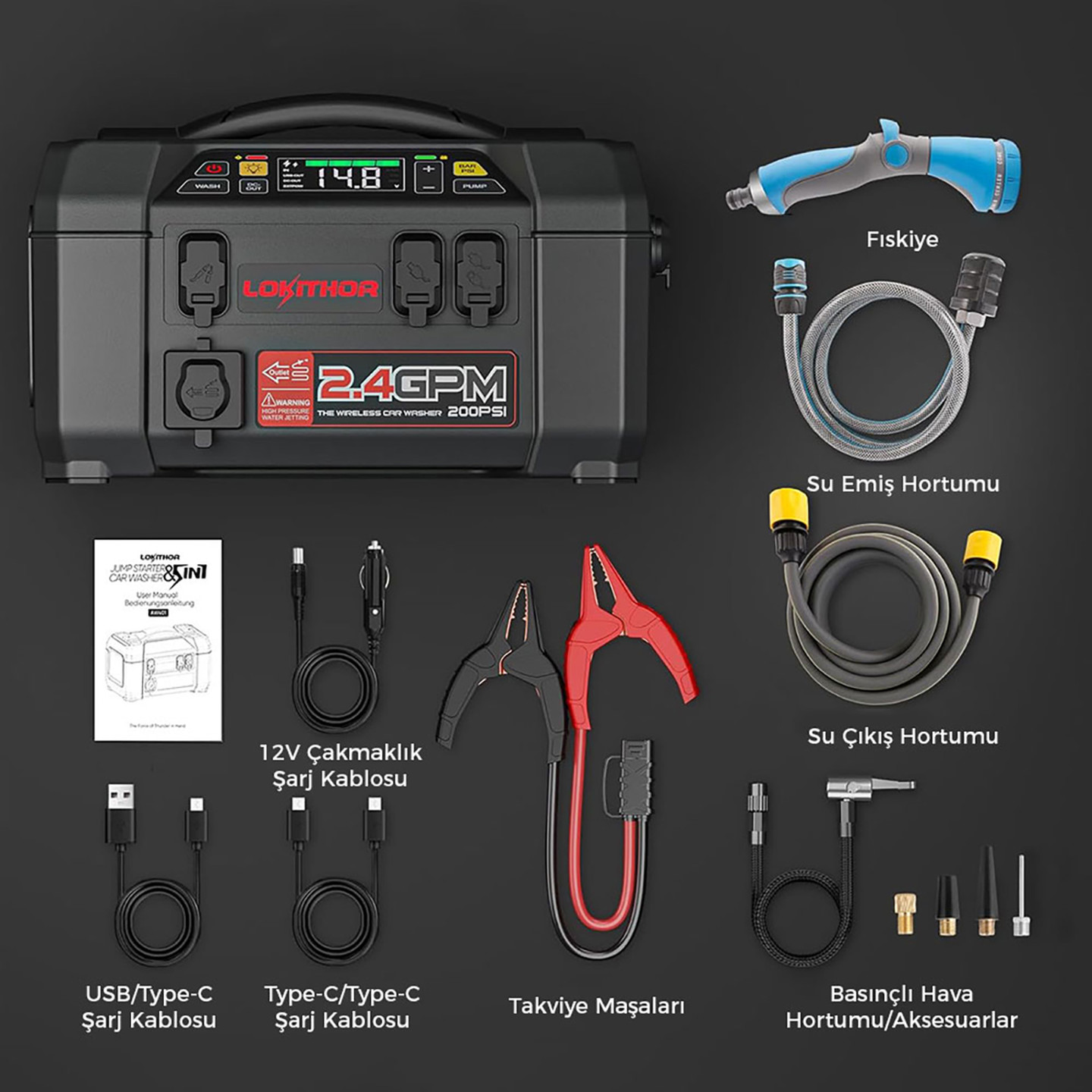 Lokithor AW401 12V 2500Amp Li-Polimer Akıllı Akü Takviye Cihazı (Pompa -Basınçlı Yıkama - Powerbank - Led Lamba)