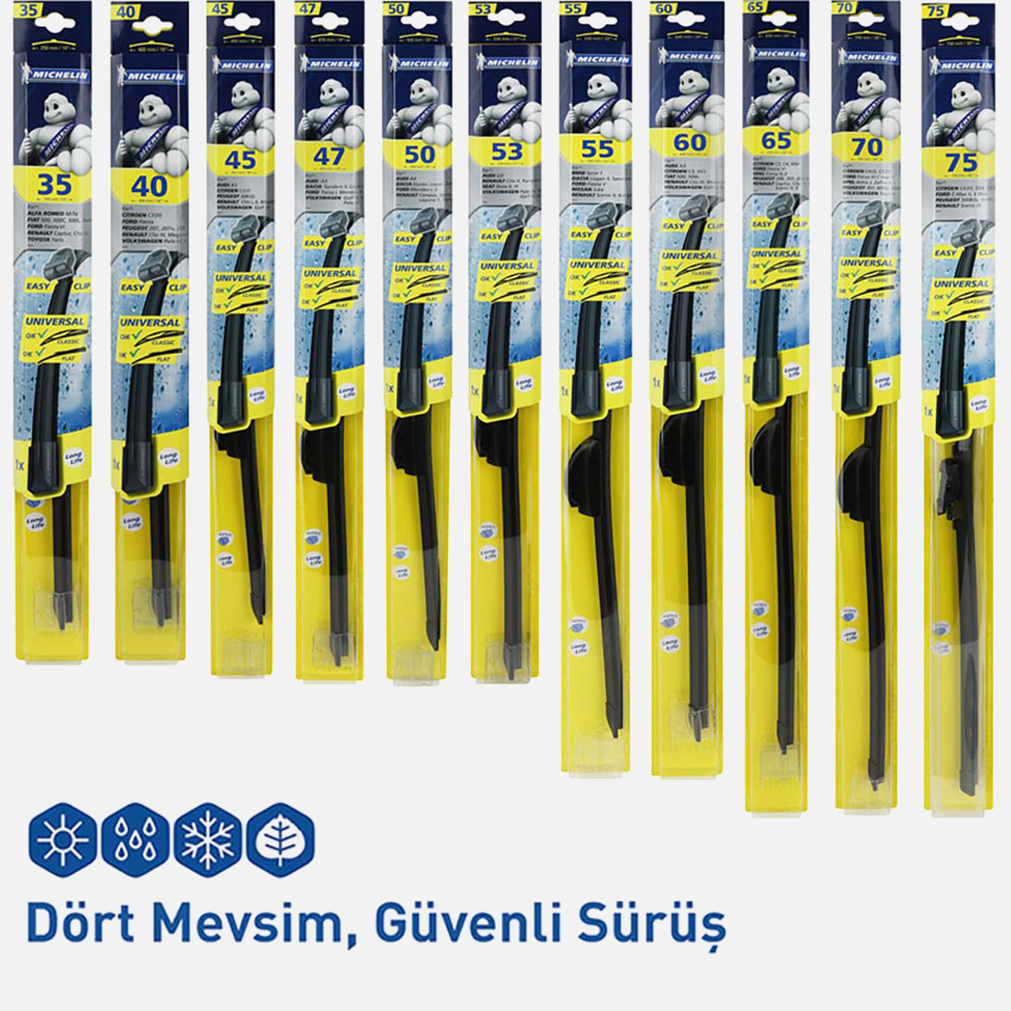 •Universal dahili adaptörler sayesinde kolay ve hızlıca takılırlar, kolay ve hızlı silecek değiştirme imkânı sağlar, her kutu içerisinde bulunan 4 farklı aparat sayesinde 7 farklı silecek koluna uyumludur.