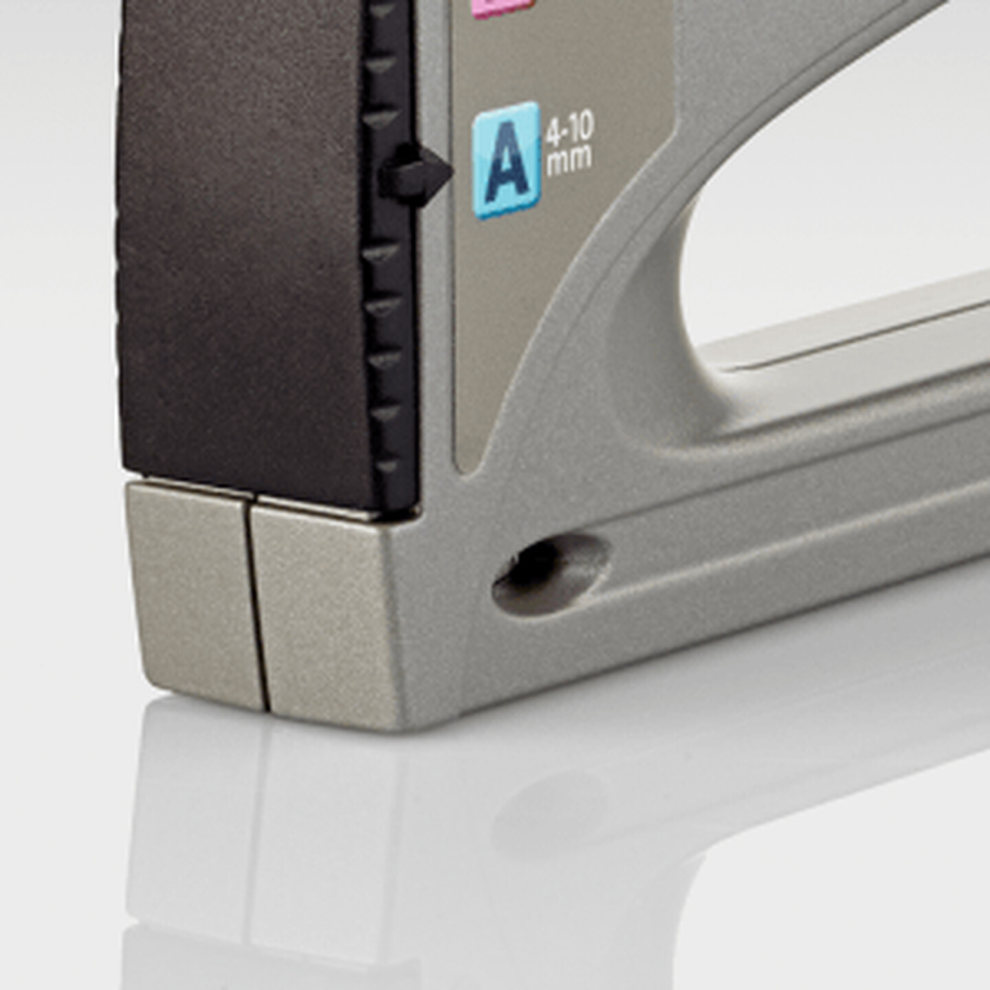 Evde amatör kullanıcıların ve atölyede ustaların kullanımına uygun çok çeşitli işler için dayanıklı, özellikle düşük geri tepmeli, çinko döküm muhafazaya sahip küçük profesyonel zımba tabancası.