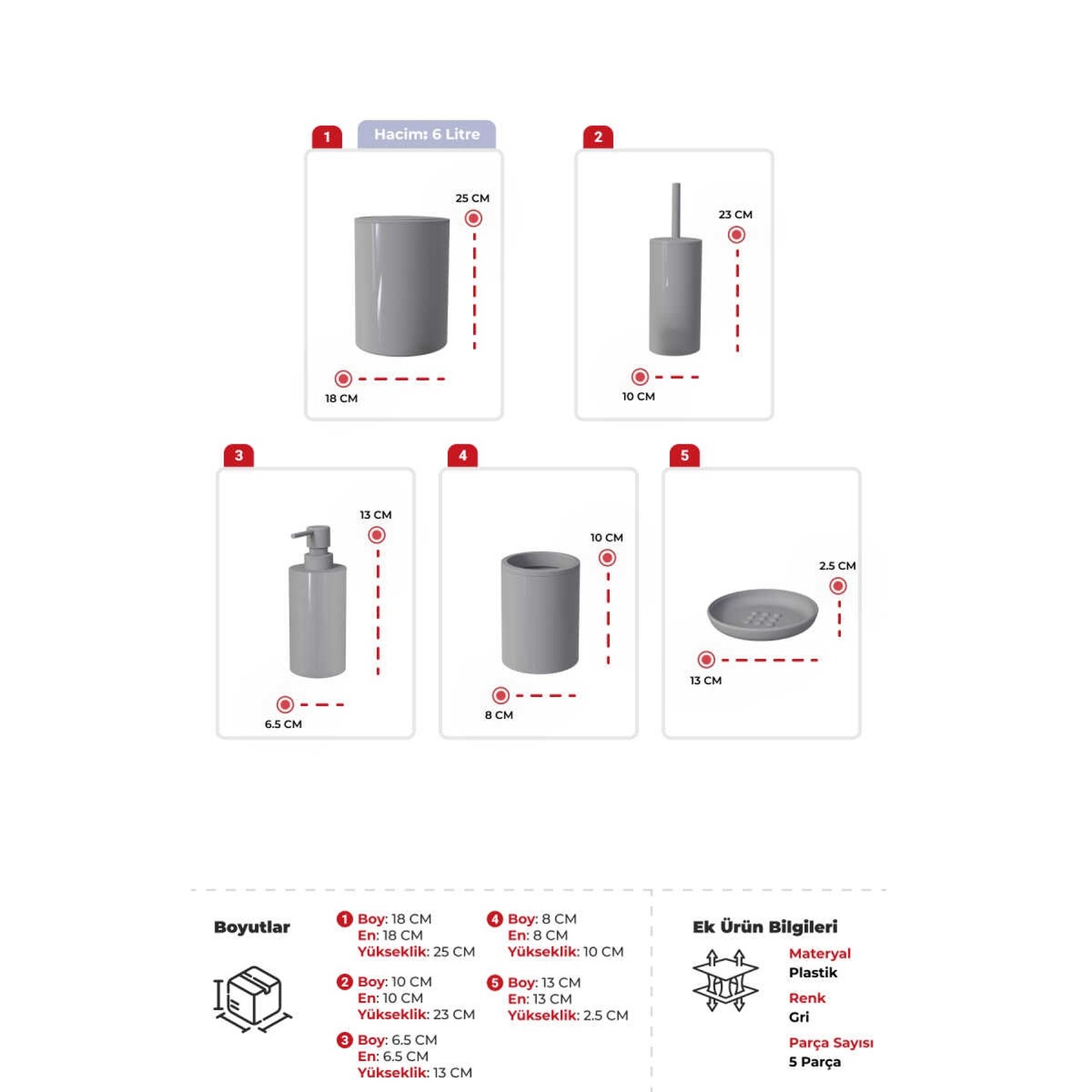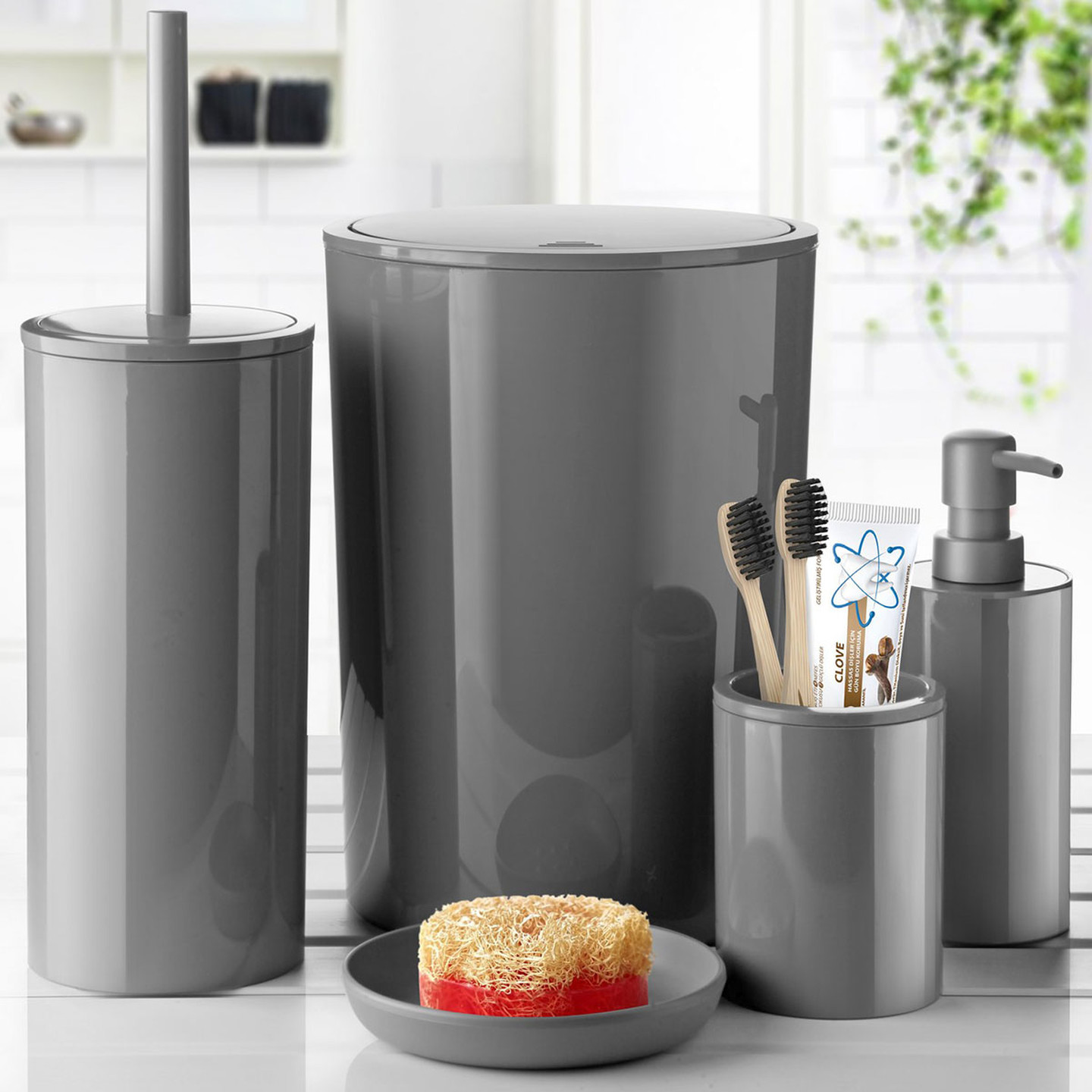 • Çöp kovası, tuvalet fırçası, sıvı sabunluk, diş fırçalık ve sabunluk