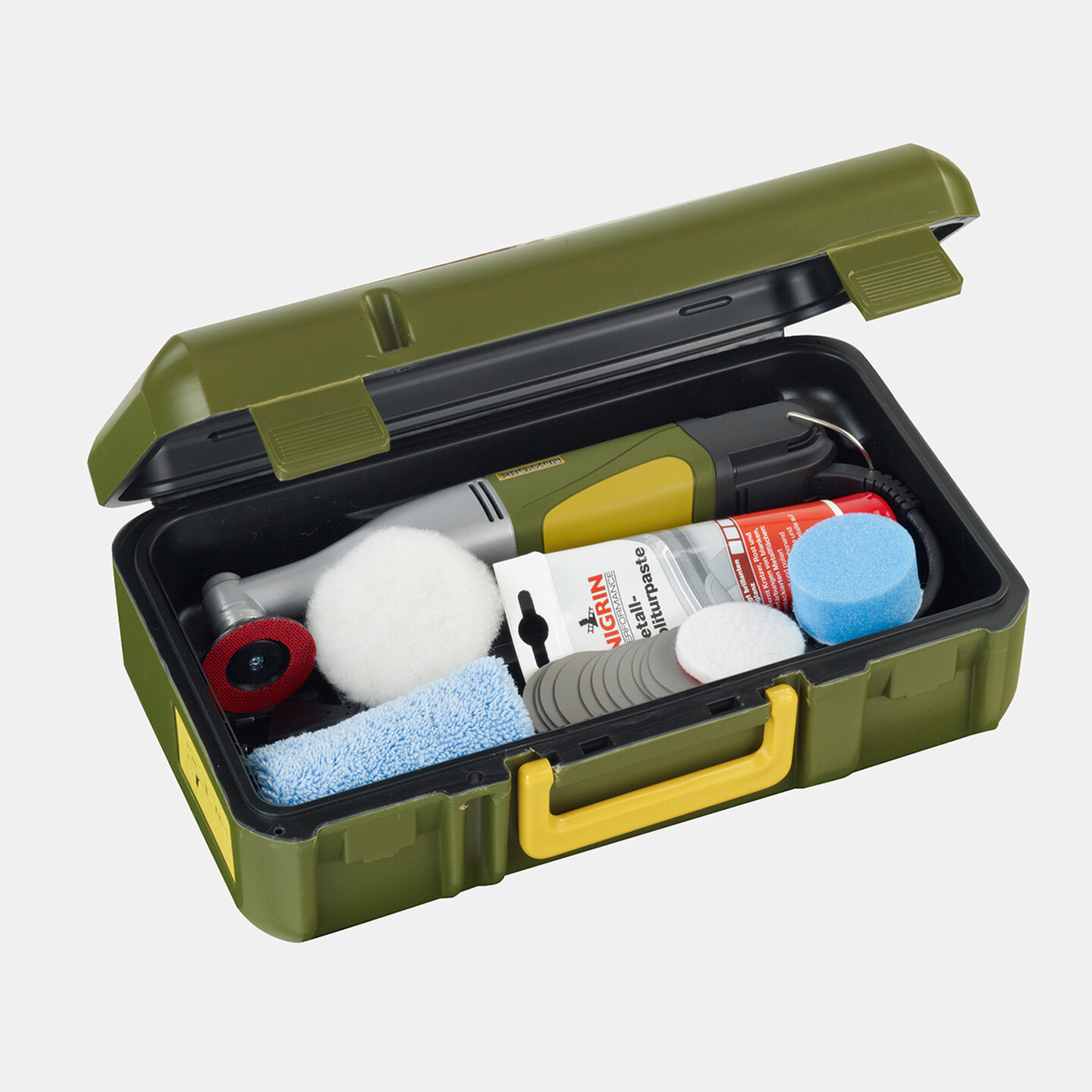 •Kutu İçeriği:Cırt cırtlı kauçuk zımpara altlığı, cilalama süngeri (orta sert), kuzu yünü cilalama diski, metaller ve demir içermeyen metaller için cilalama keçesi (orta sert), 12 kumlama diski K 2000 ve NIGRIN parlatıcı emülsiyon (75ml) ve mikrofiber bez.