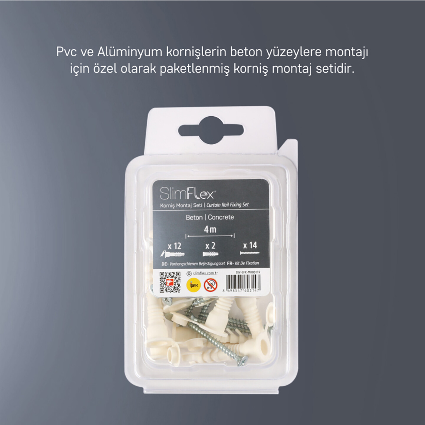 • Pvc ve Alüminyum kornişlerin beton yüzeylere montajı için özel olarak paketlenmiş korniş montaj setidir.
