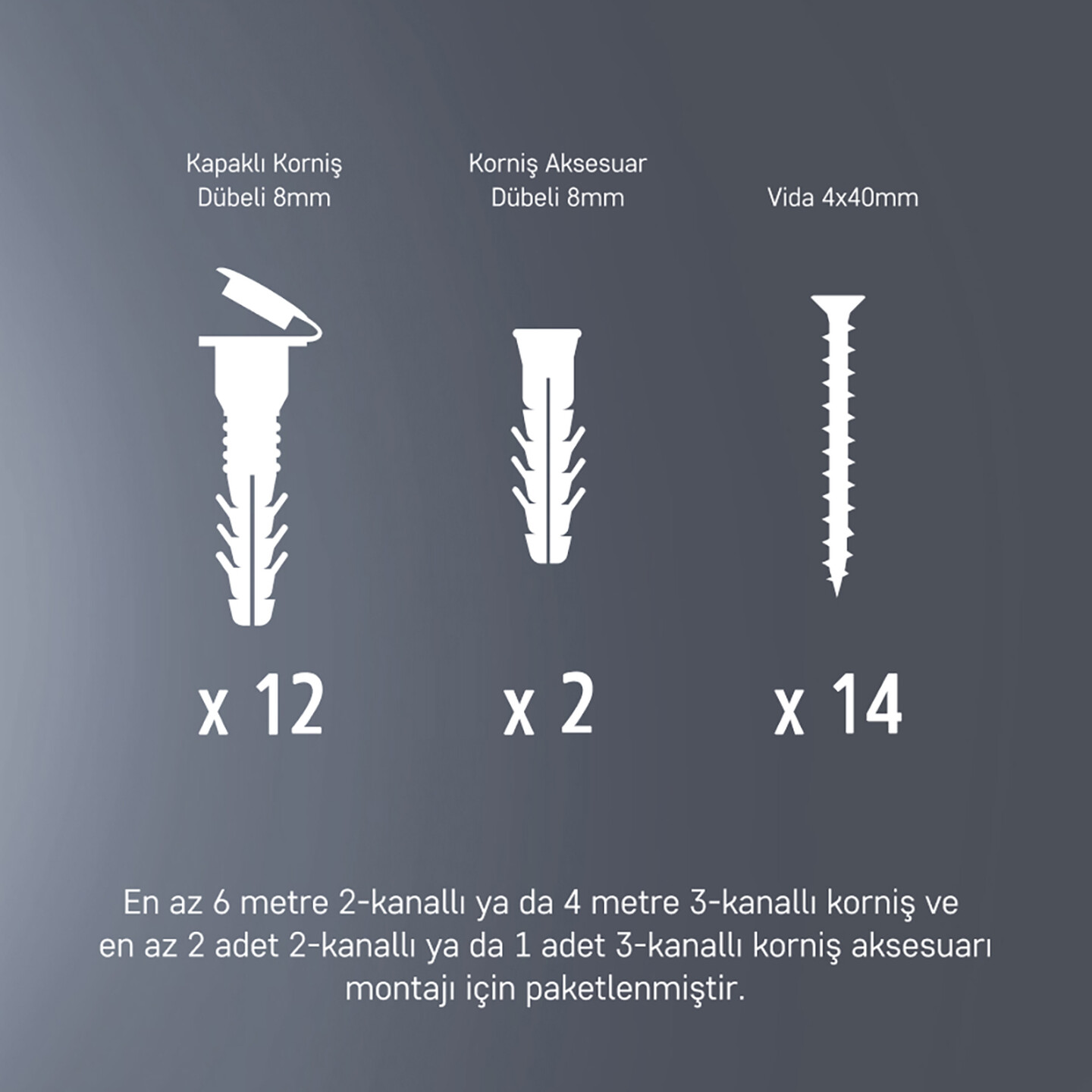 • Ayrıca en az 2 adet 2-kanallı ya da 1 adet 3-kanallı korniş aksesuarı monte etmek için aksesuar dübel ve vidaları içermektedir.