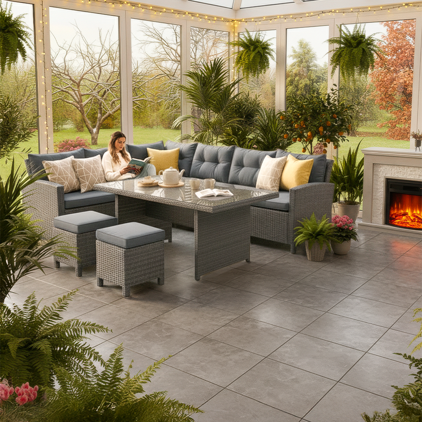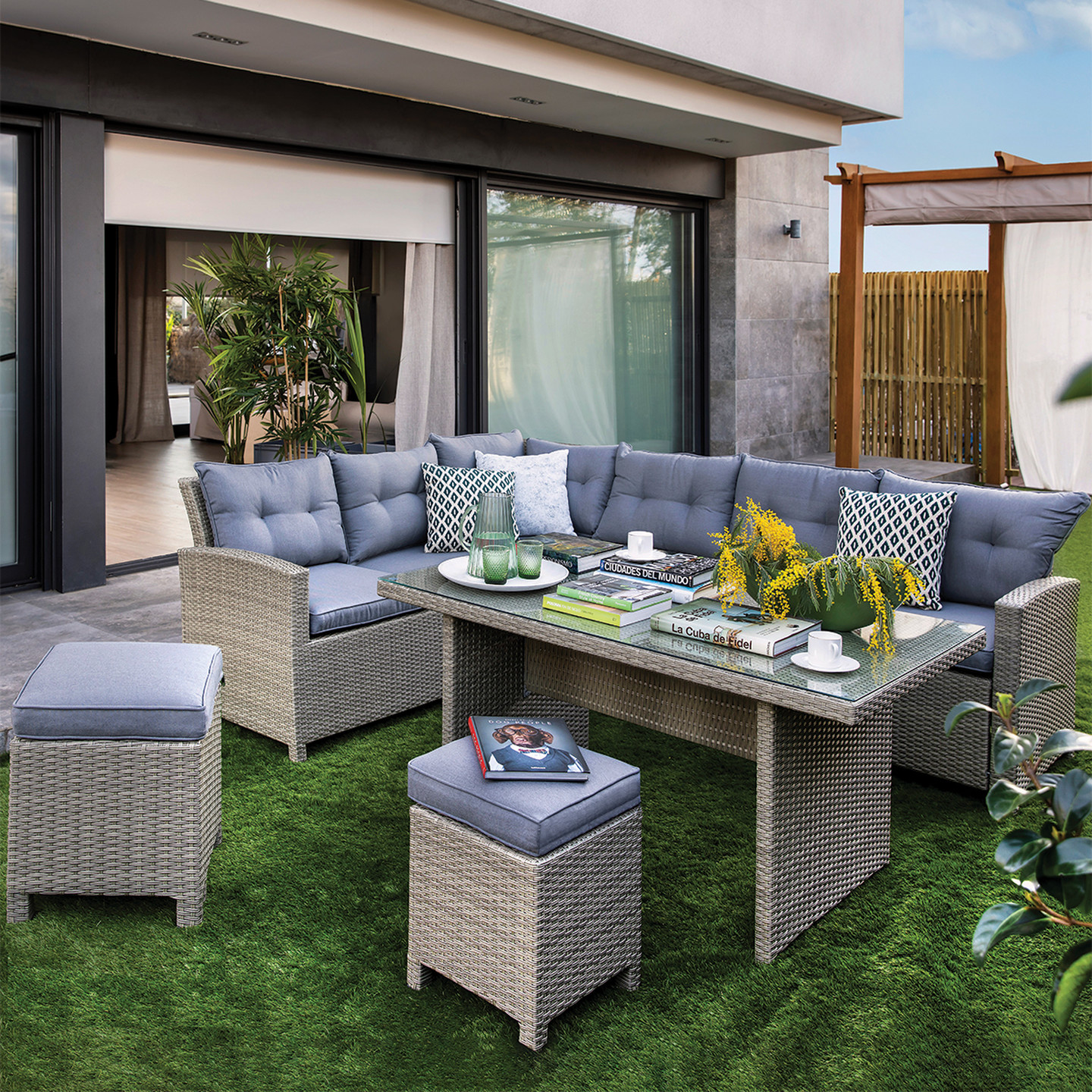 • Sunfun Silvana Rattan Köşe Oturma Grubu, adeta konfor kelimesinin karşılığı. Yemek masası, pufları ve minderleriyle dört dörtlük bir set.