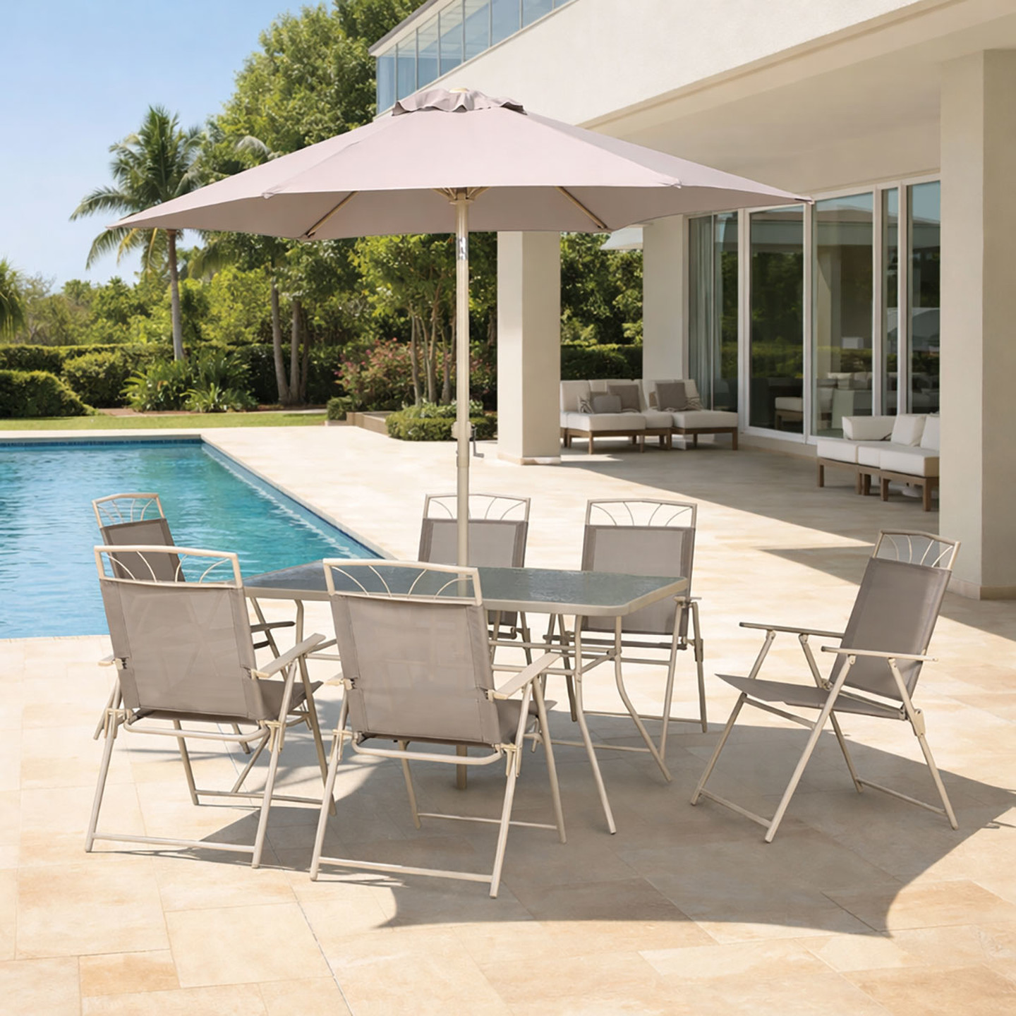 8 Parça Set: 6 adet ergonomik sandalye + 1 adet geniş masa + 1 adet ayarlanabilir şemsiye