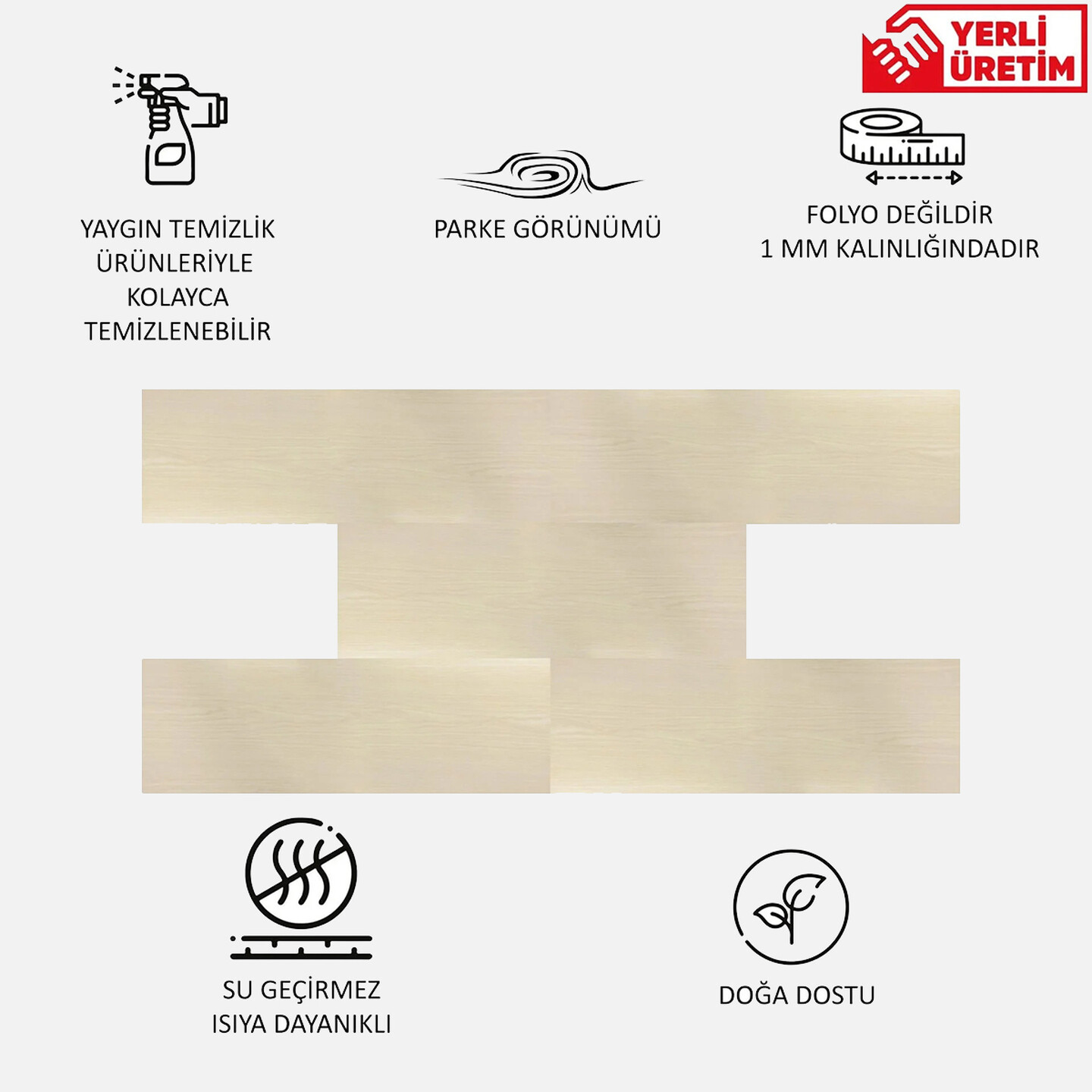 • Yapışkanlı Parke Görünümlü Kaplama folyo değildir, 1 mm kalınlıkta çevre dostu pvc malzemeden iki katmanlı olarak üretilmiştir.