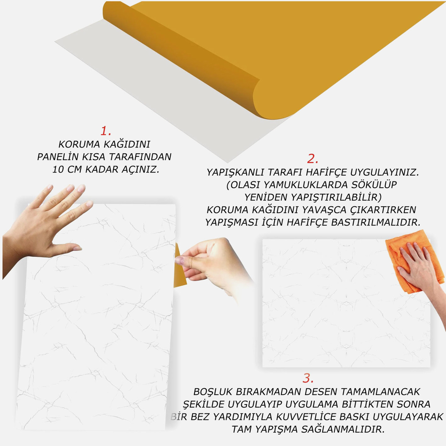 • Pvc karonun arka yüzündeki koruyucu bandı çıkardıktan sonra sıkıca bastırarak uygulayacağınız zemin üzerine yapıştırın.