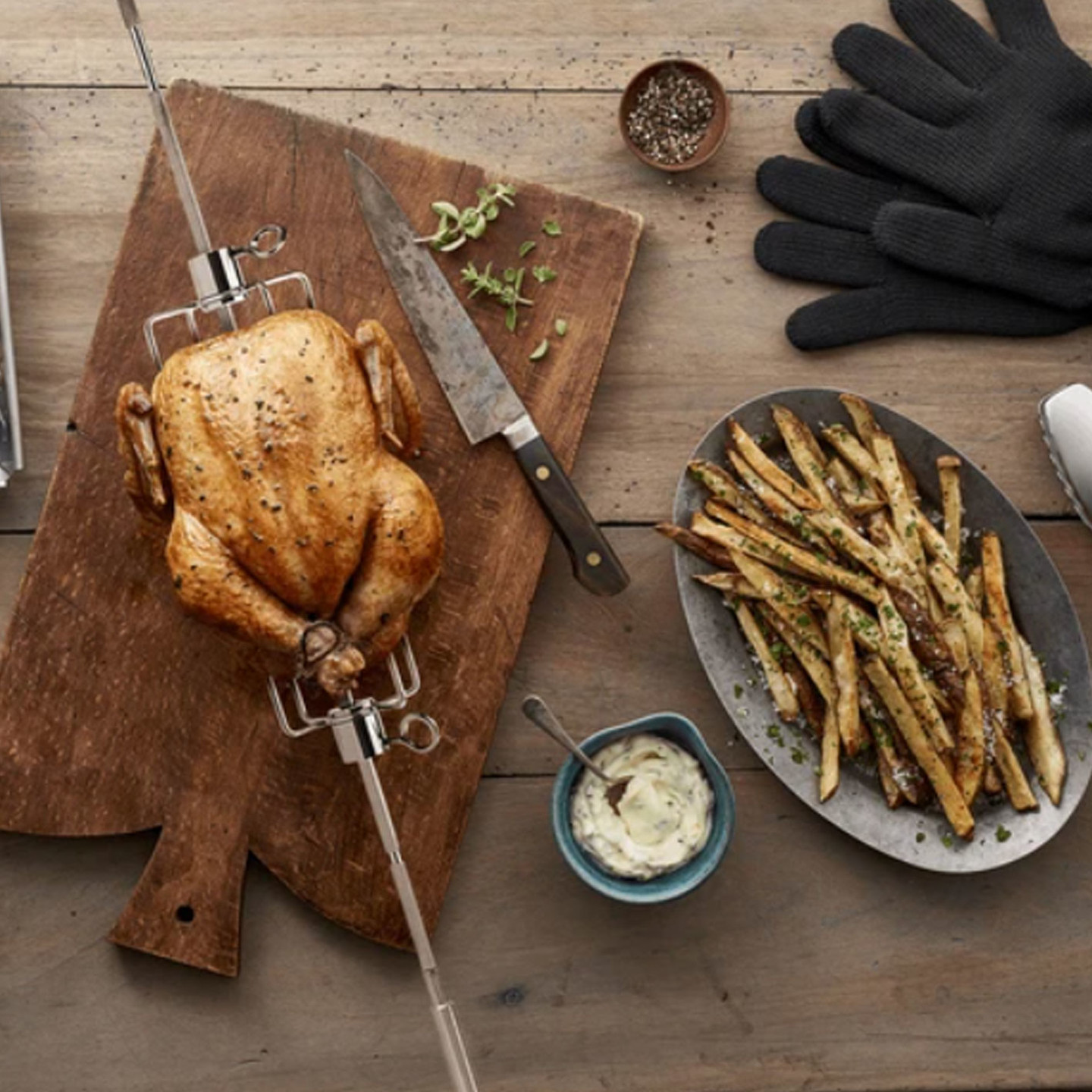 • Çevirme aparatı, yiyecekleri pişirme ızgarasının üzerinde nazikçe döndürerek doğrudan arka bahçenizdeki mutfağınızdan etli, kendi kendine pişirilmiş et üretir.