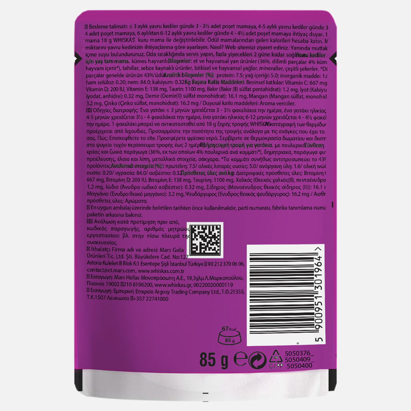 Bileşenler: et ve hayvansal yan űrűnler (36%, dilimli parçalar 4% kümes hayvanı içerir*), tahıllar, sebze kaynaklı ürünler, bitkisel ve hayvansal yağlar, mineraller, çeşitli şekerler. *Dilimli parçalar genelde ürünün 43%’üdür.Analitik bileşenler (%): protein: 7.5; yağ içeriği: 5.0; inorganik madde: 1.6; ham selüloz: 0.20; nem: 84.0; kalsiyum: 0.32.Kg Başına Katkı Maddeleri: Besinsel katkılar: Vitamin C: 667 mg, Vitamin D₃: 200 IU, Vitamin E: 138 mg, Taurin: 1100 mg, Bakır (Bakır (II) sülfat pentahidrat): 1.2 mg, İyot (Kalsiyum iyodat, anhidre): 0.32 mg, Demir (Demir(II) sülfat monohidrat): 16.1 mg, Mangan (Mangan sülfat, monohidrat): 3.2 mg, Çinko (Çinko sülfat, monohidrat): 16.2 mg / Duyusal katkı maddeleri: Aroma vericiler.