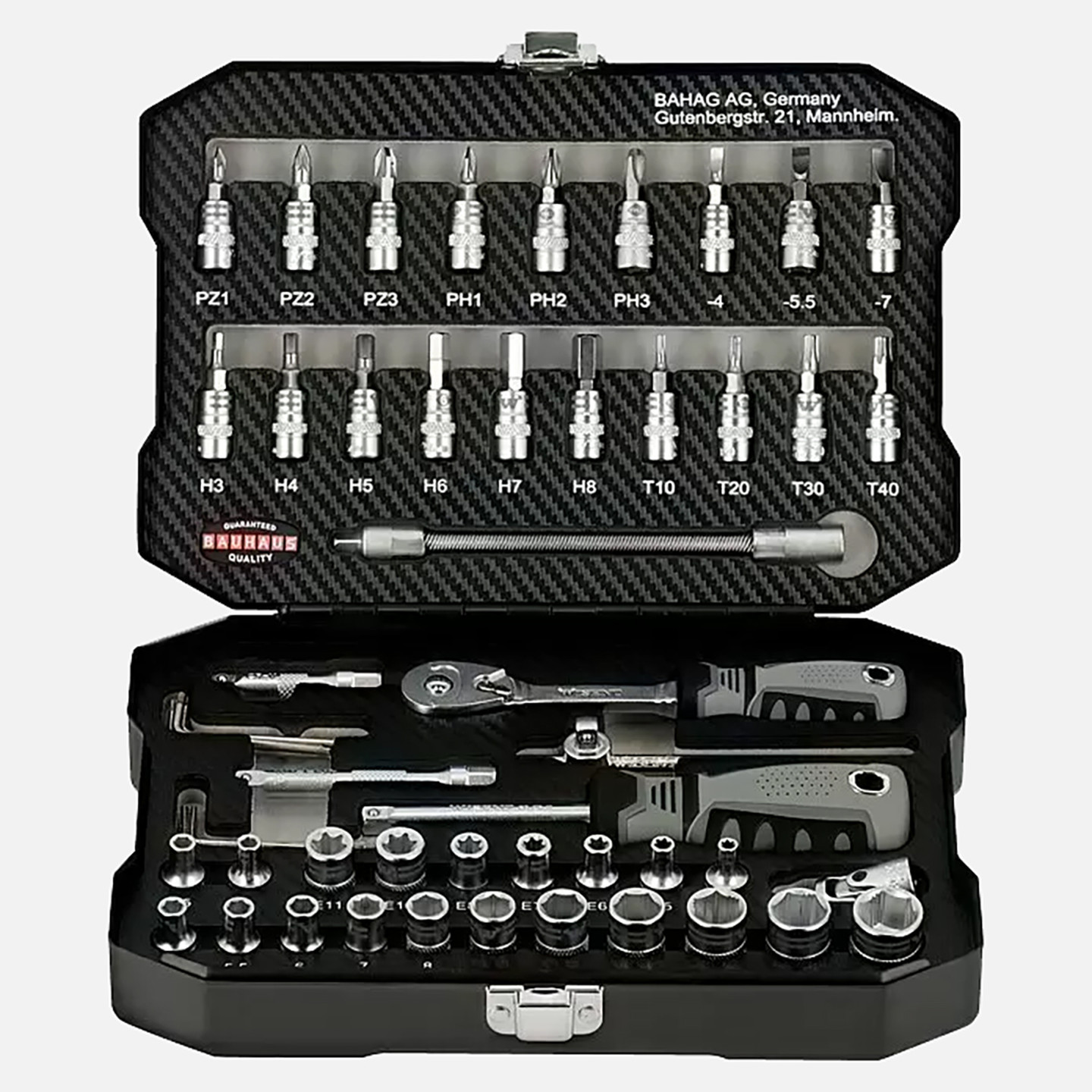13 x lokma anahtar ucu 1/4 4/4,5/5/5,5/6/7/8/9/10/11/12/13/14 mm, 7 x lokma anahtar ucu 1/4 E4/E5/E6/E7/E8 /E10/E11 , 3 x bit 1/4 PZ 1/2/3, 3 x bit 1/4 PH 1/2/3, 3 x bit 1/4 SL 4/5.5/7, 6 x bit 1/4 HEX H3/H4 /H5/H6 /H7/H8, 4 x uç 1/4" TX 10/20/30/40, 1 x oynak mafsal 1/4", 2 x uzatma 1/4" 50/75 mm, 1 x esnek uzatma 1/4" 150 mm, 1 x T kolu ¼ ″, 1 x kolu 1/4", 1 x ters çevrilebilir cırcır 1/4", 3 x lokma anahtar, T6,T7,T8, 4 x Allen anahtarı 1,27/1,5/2,0/2,5 mm